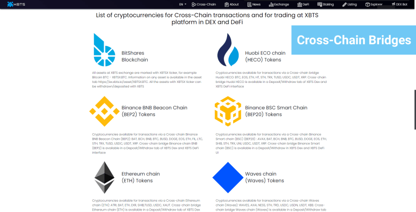 XBTS is a Multi-chain decentralized exchange and DeFi operating at BitShares blockchain since 2018. XBTS is a leading-edge Dex for trade, DeFi, staking, exchange, holding cryptocurrencies, Cross-Chain transactions, and an entry point to volumes of decentralized markets.