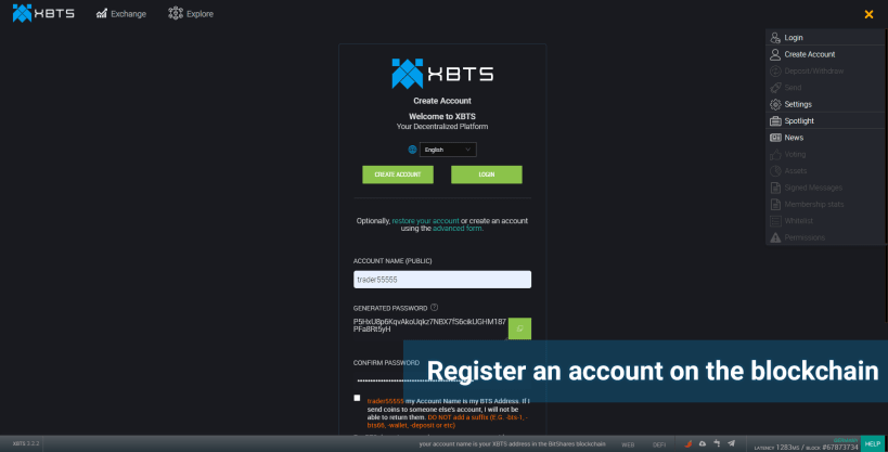 Quick registration of an account in the blockchain. Your account at XBTS is your address in BitShares Blockchain. Save the passphrase issued by the blockchain during registration in a safe place!