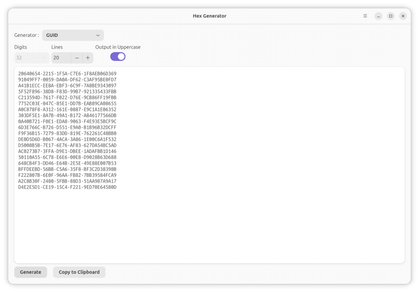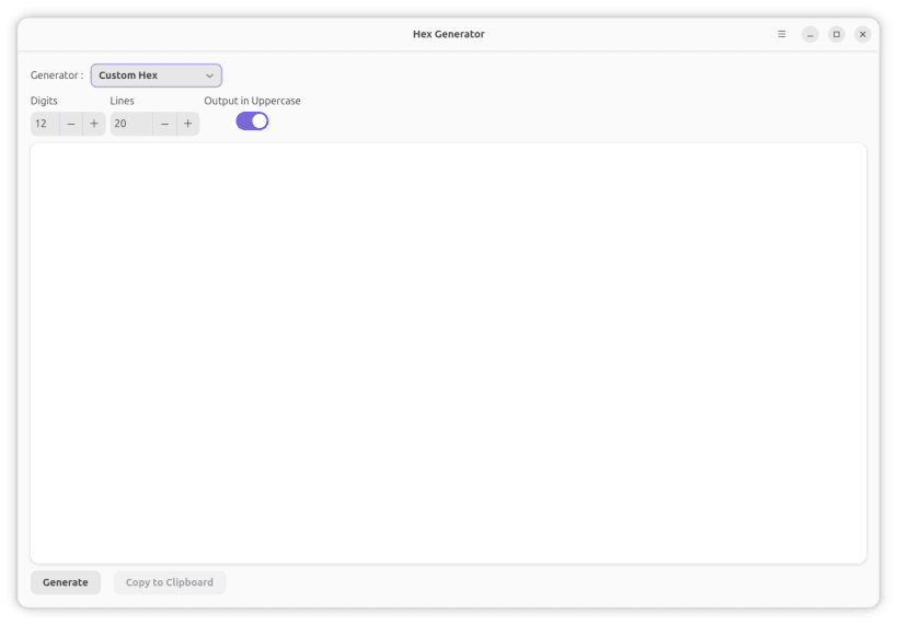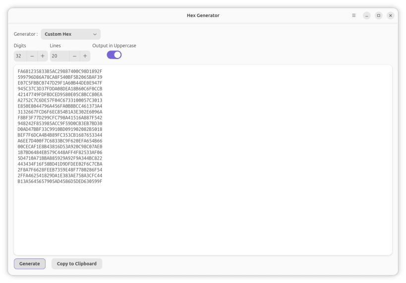 A simple yet versatile HEX Generator application built with Flutter for Linux desktops.