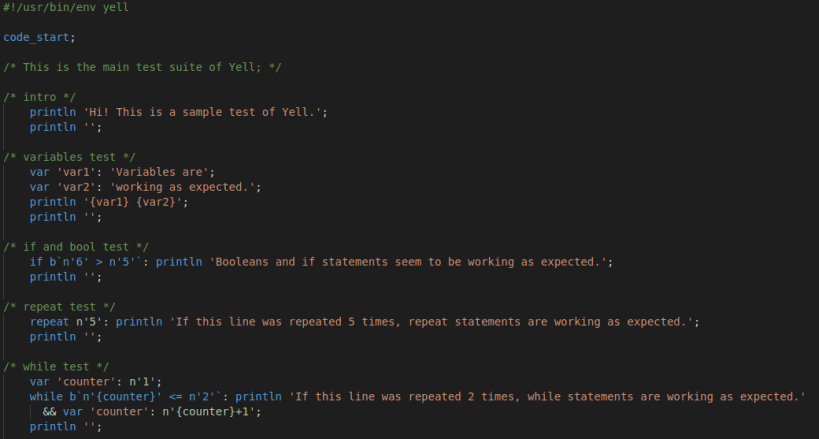 Yell is an extremely simple language for new programmers. This is a Python implementation of it, and while it isn't the fastest, that's not it's intended purpose. It's lightweight and extremely simple to use. It only has one dependency, Python (which is included in this snap). It also provides limited integration with Python.