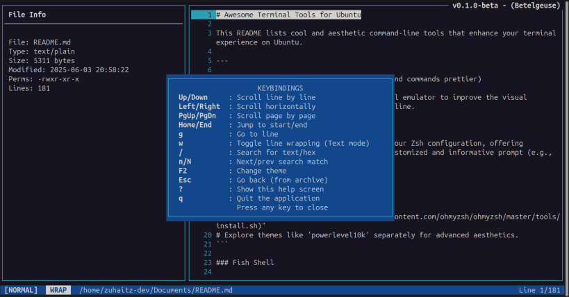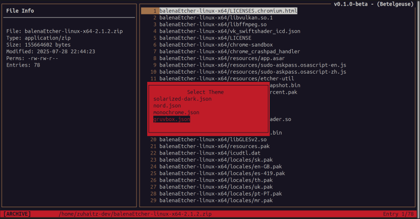 FAT is a modern, TUI-based file and archive viewer for your terminal. It's designed for developers and power users who want to quickly inspect files and peek inside archives like .zip and .tar without having to extract them first. It is lightweight, fast, and highly extensible.