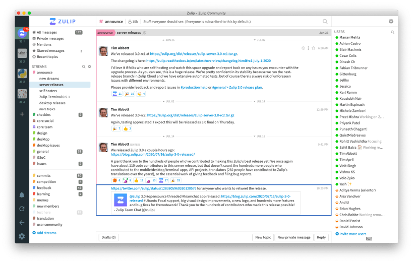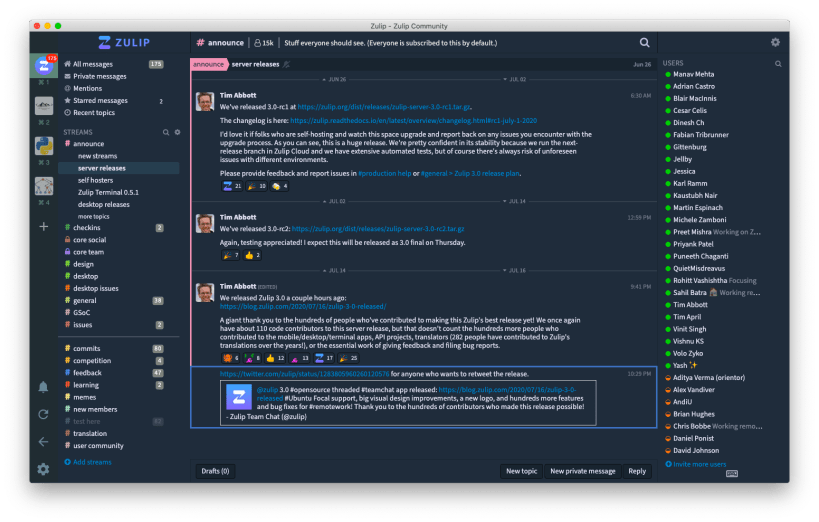 Zulip combines the immediacy of real-time chat with an email threading model. With Zulip, you can catch up on important conversations while ignoring irrelevant ones.
